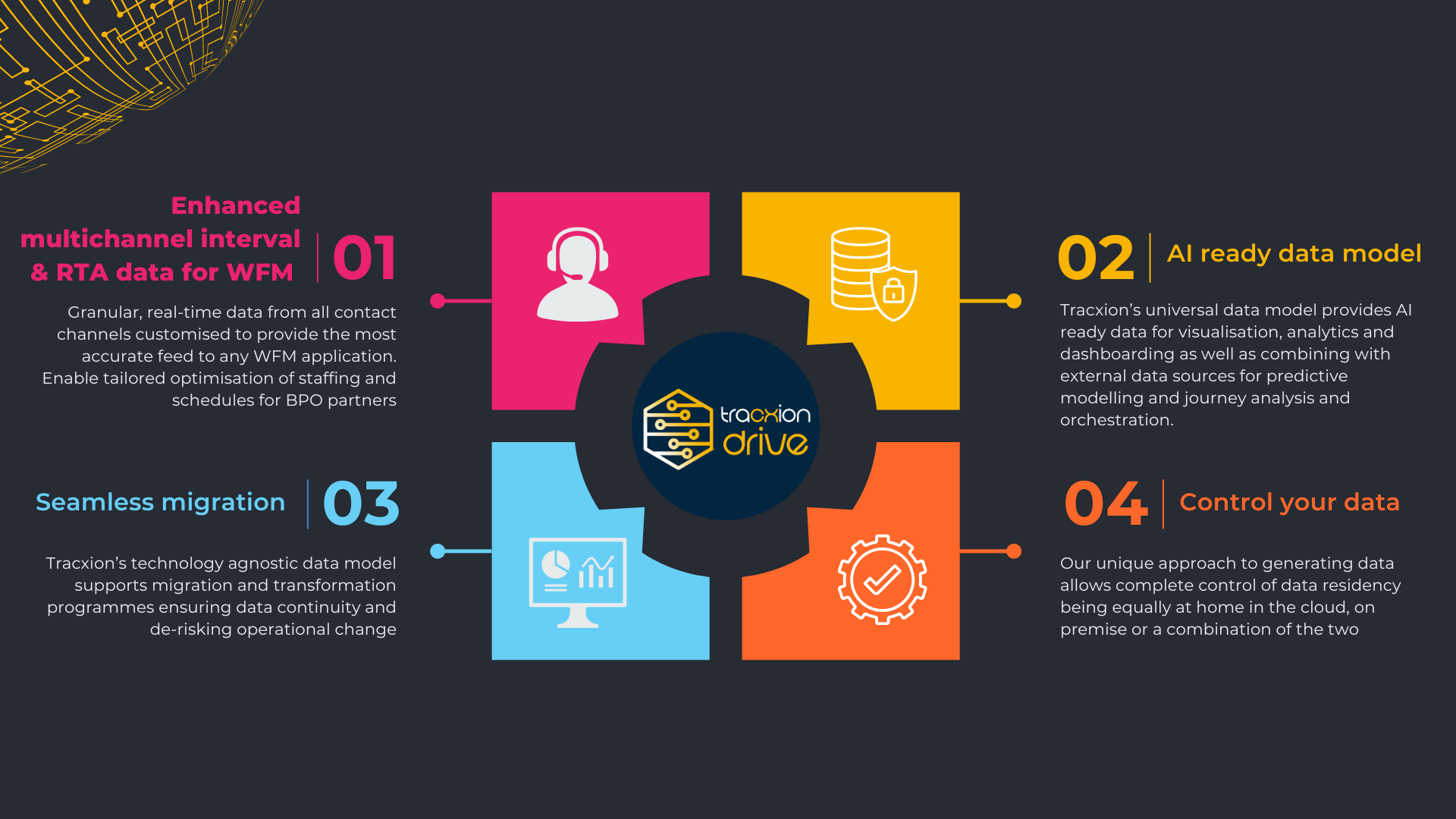 Tracxion Drive replaces your existing WFM adapter to simplify and de-risk cloud migration. Seamless integration with Genesys CX maintains data integrity across platforms, reducing migration risks and costs by preserving operational data integrity for ongoing WFM, reporting, and insights.