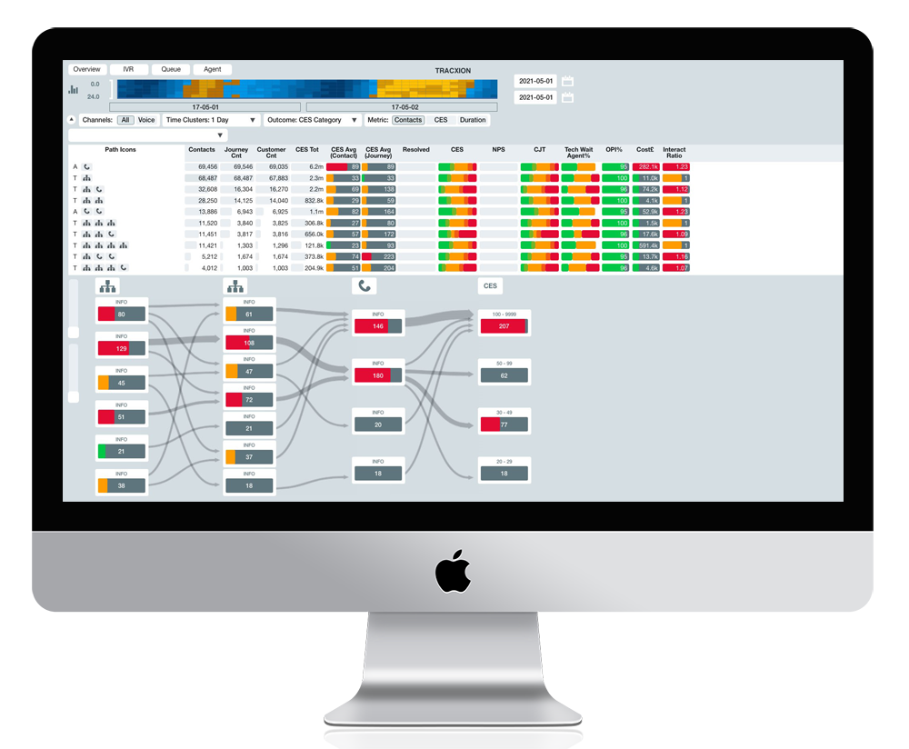 A telco customer had forecast a resource deficit and were planning to recruit an additional 1000 new agents into their frontline customer service organisation – by looking at Tracxion’s associated outbound data we were able to show the client that the problem was due to shortfalls in resourcing in the second line support queues, and could be solved by employing in the region of 200 agents across 3 of their support teams, without the need for more frontline support.